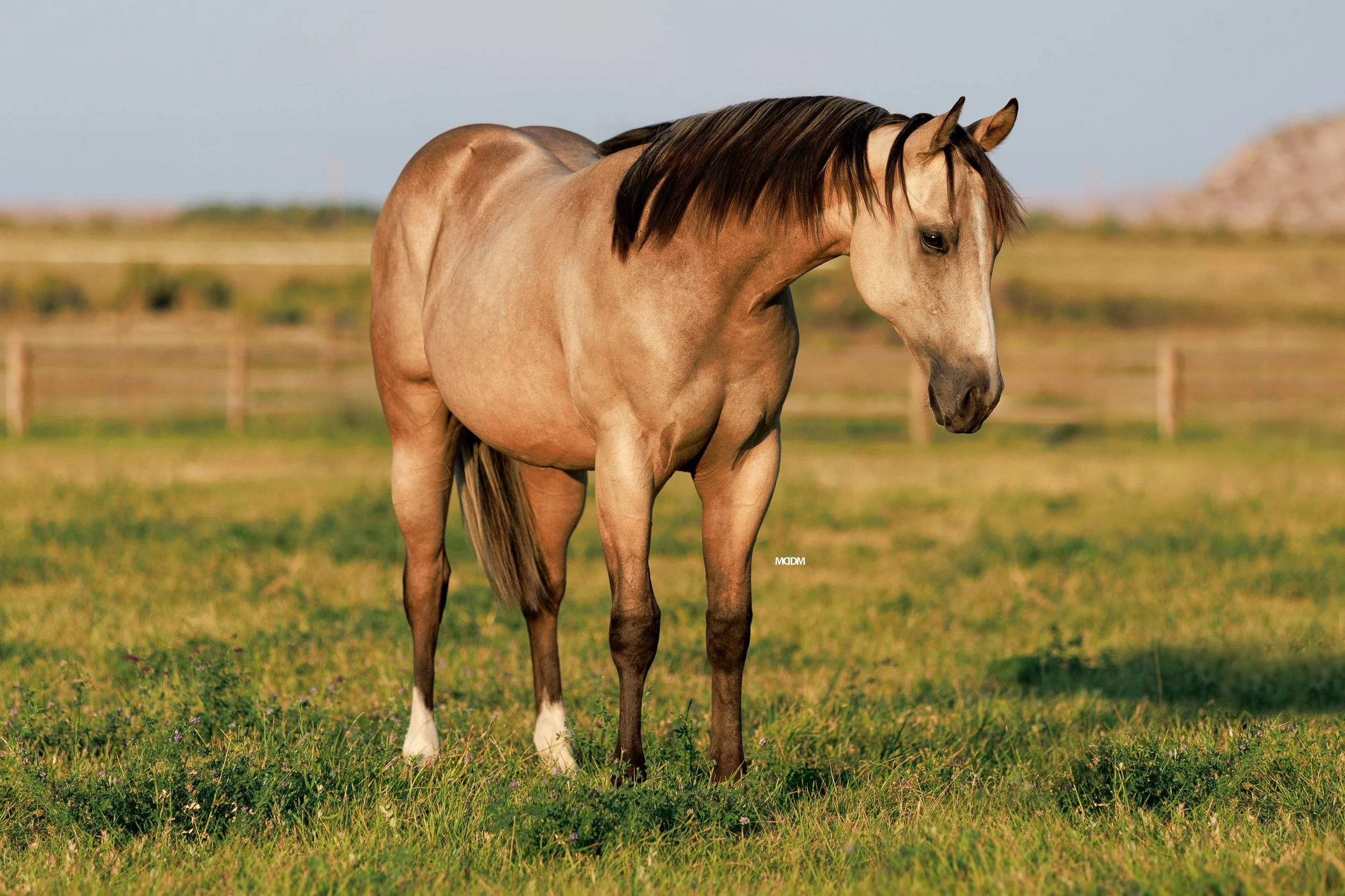 A brown horse with a gray coat and white socks on its back right and front left legs standing in a grassy field.