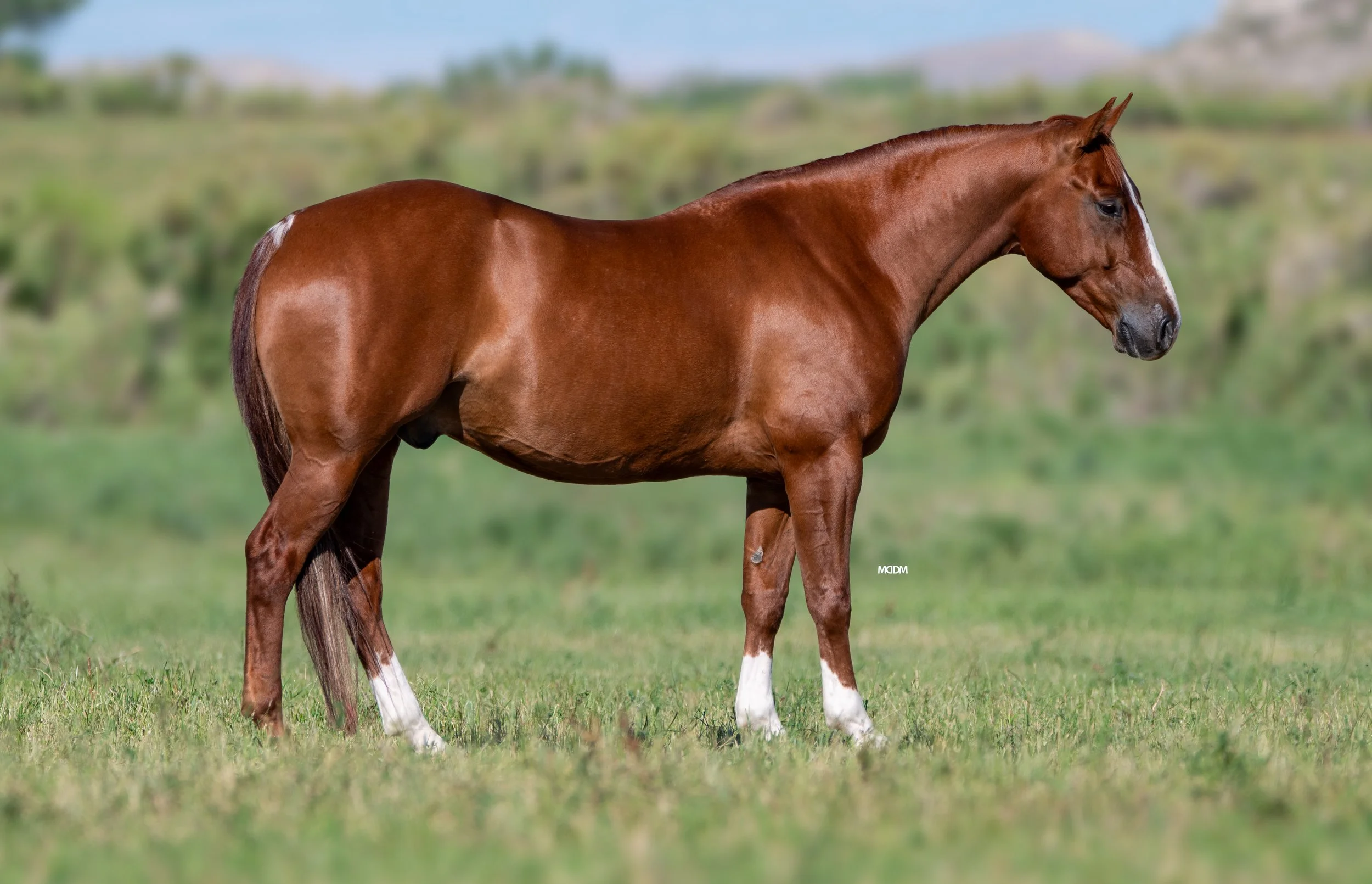 A brown horse with white markings on its legs standing in a grassy field with a blurred green background.