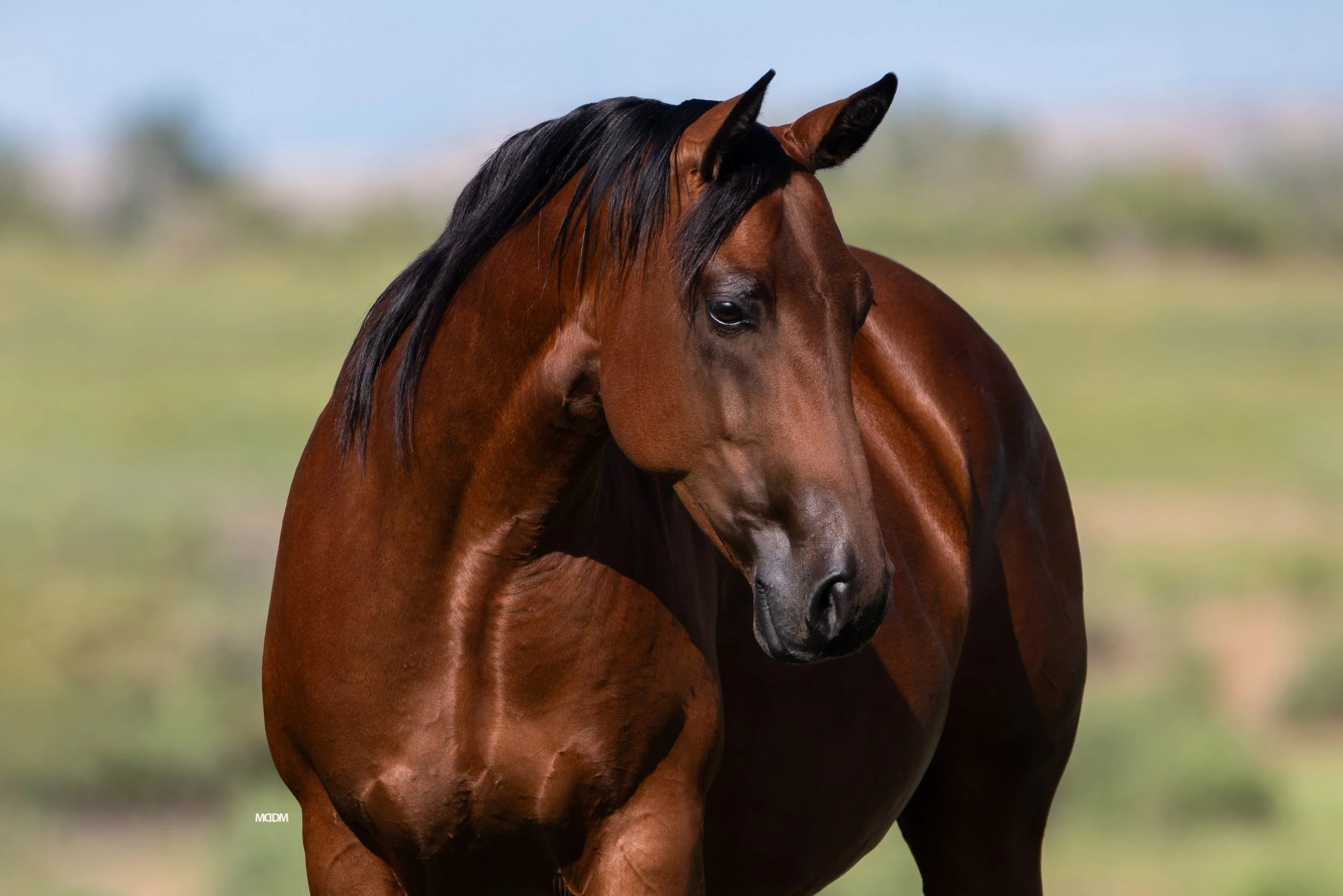 A chestnut horse standing on a grassy field with a blurred landscape in the background.