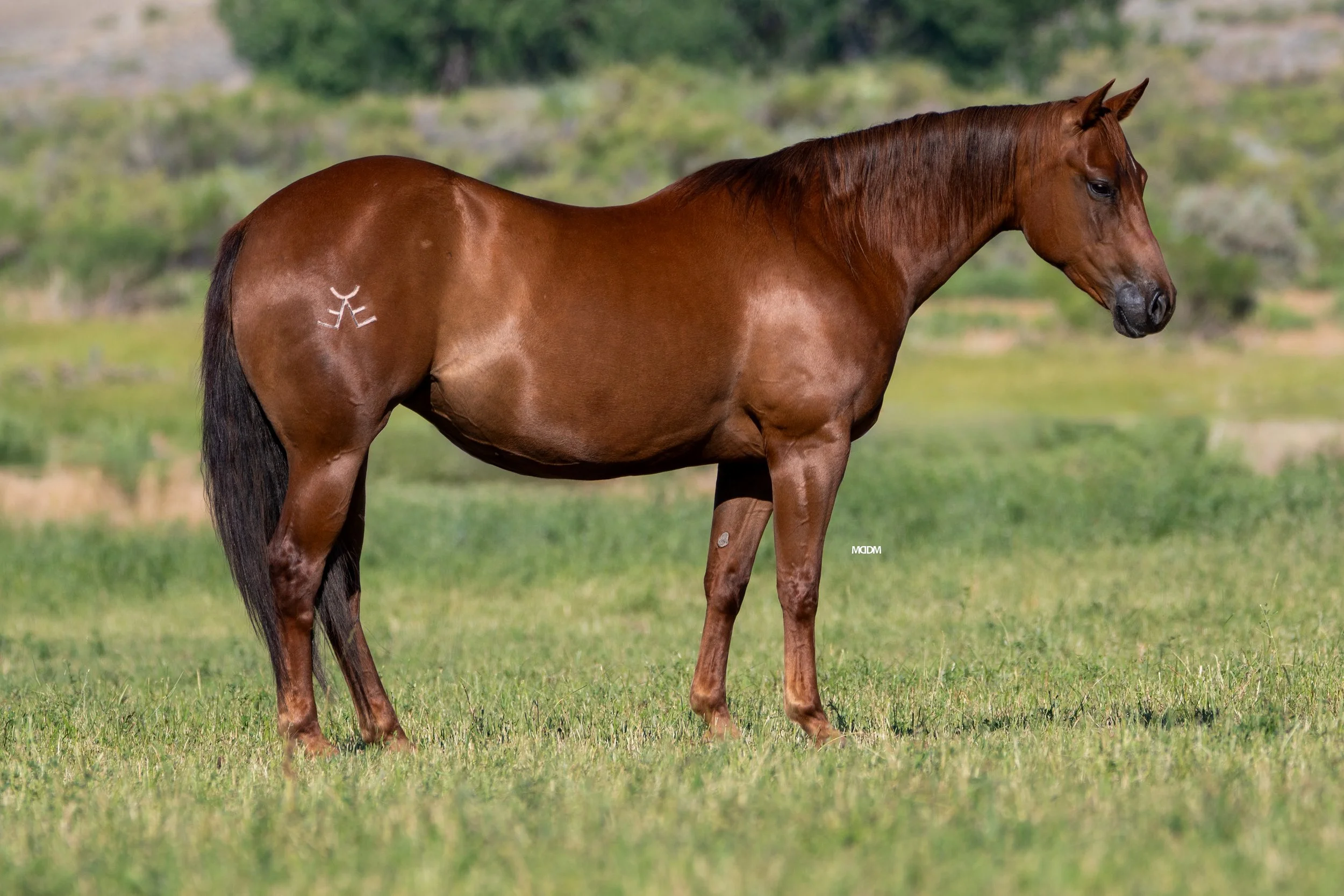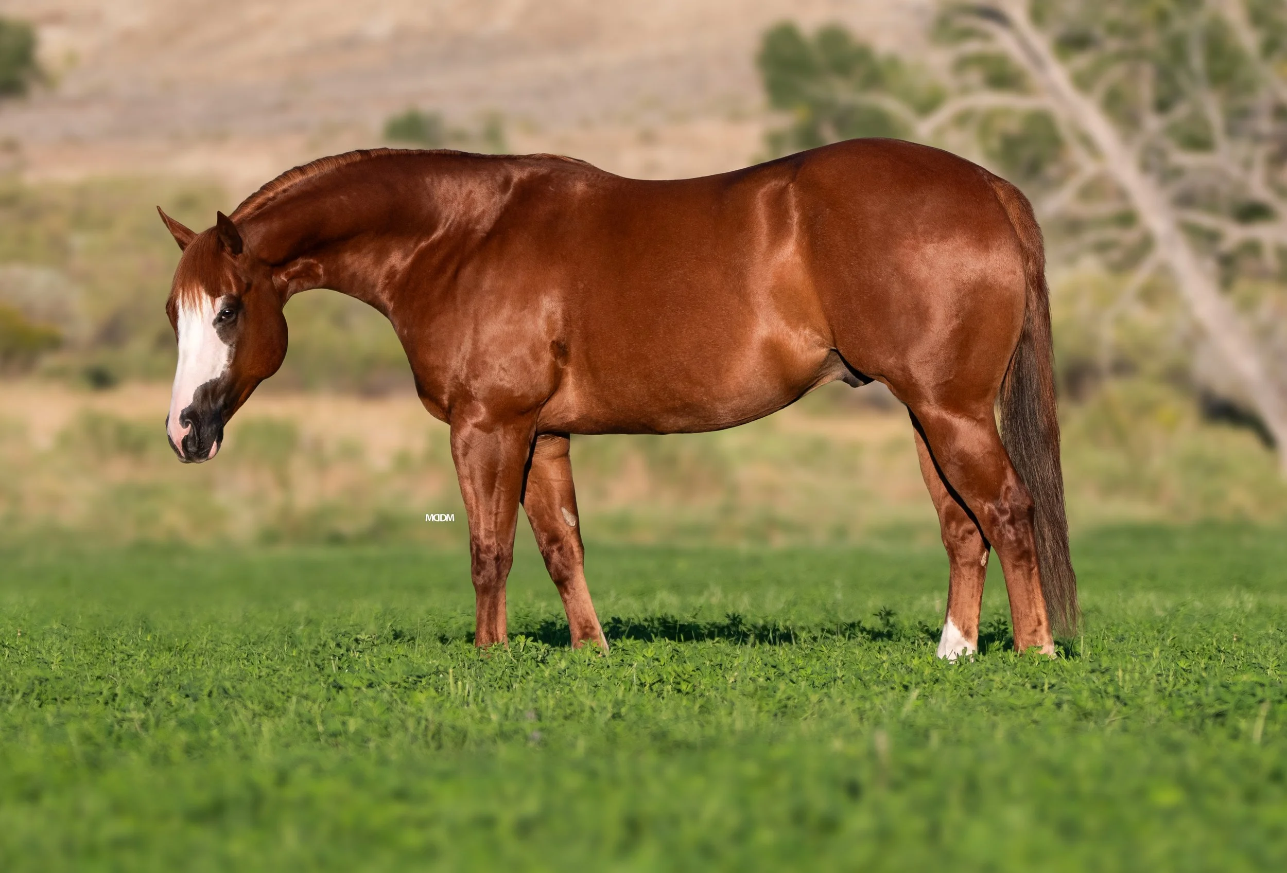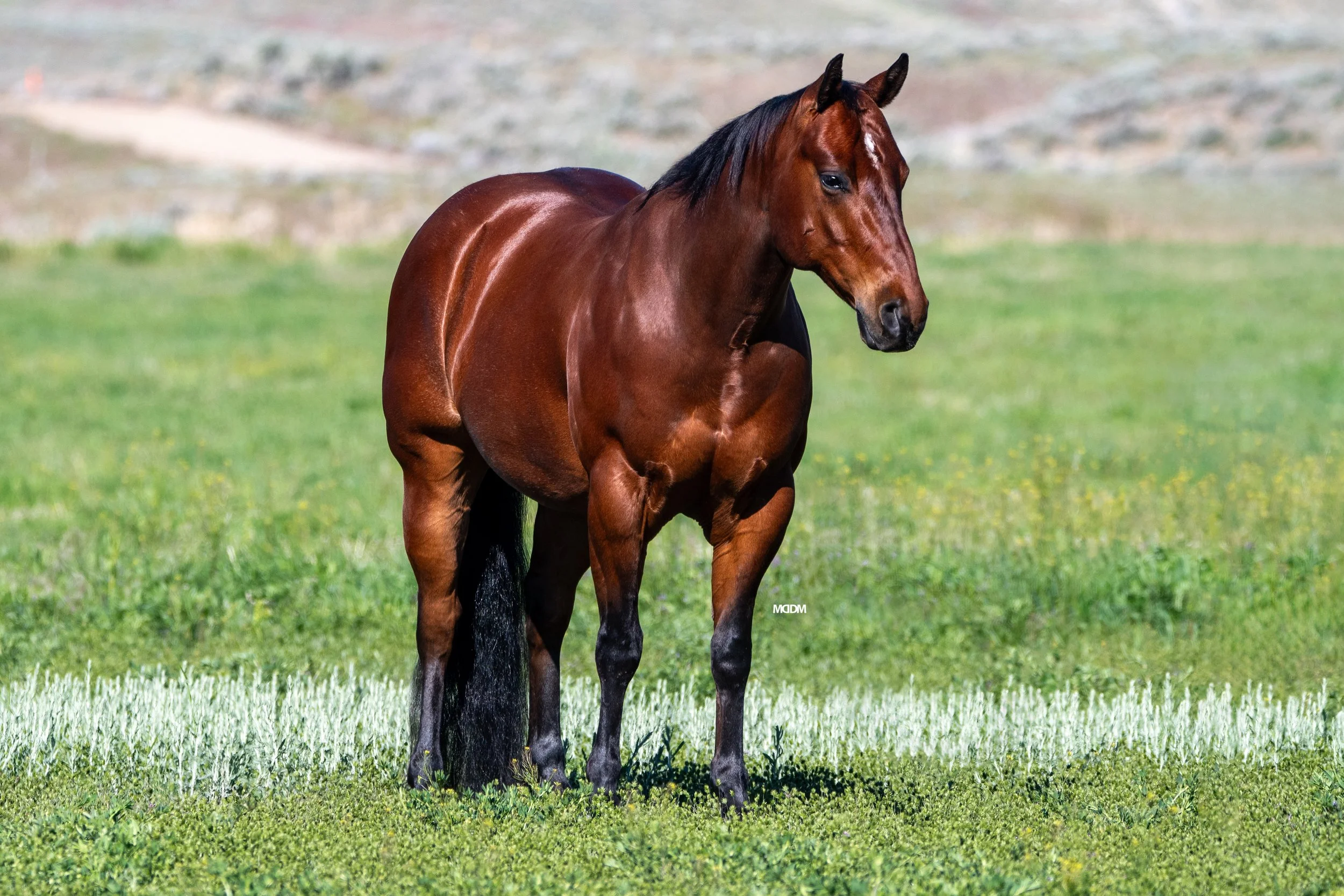 A chestnut horse standing in a grassy field with a blurred background of dry hills.