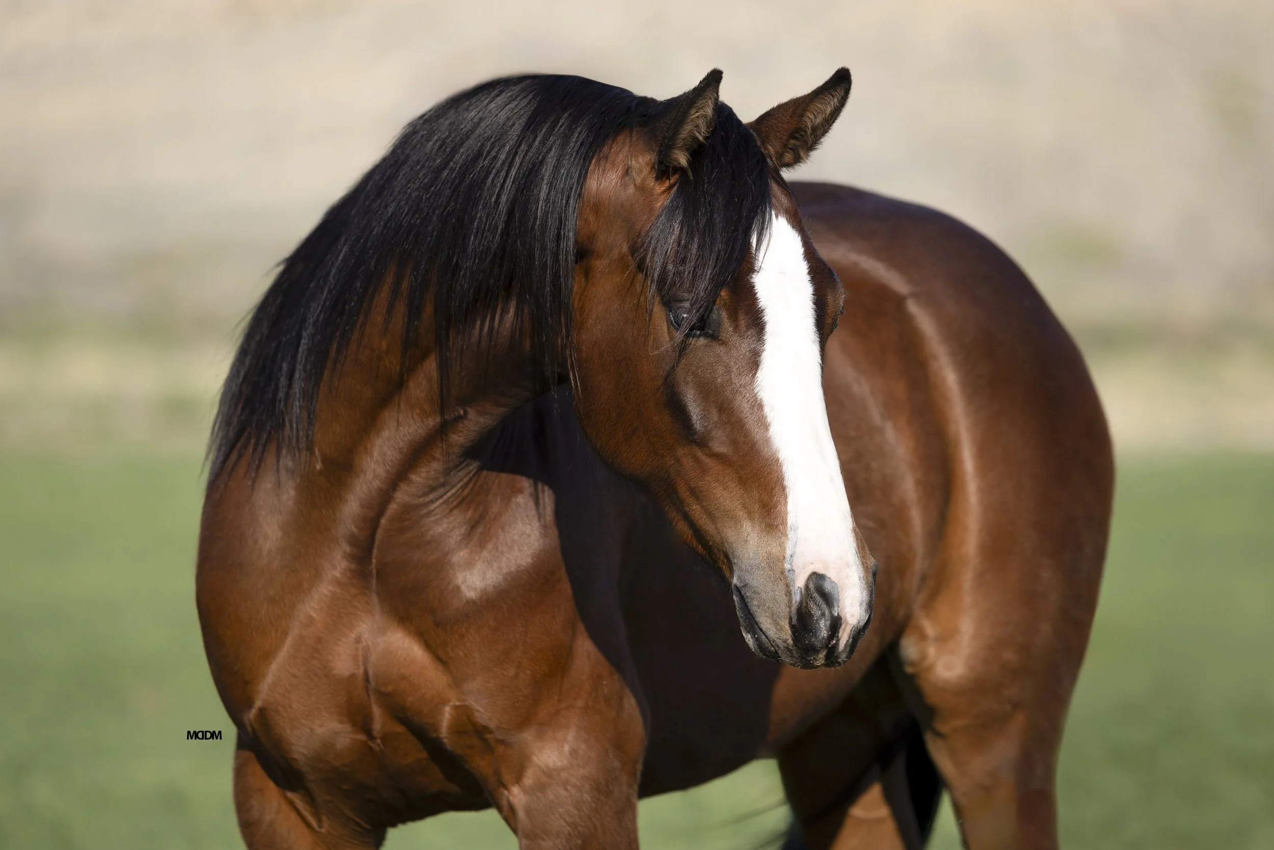 Close-up of a chestnut horse with a white blaze on its face, standing outdoors with a blurred natural background.