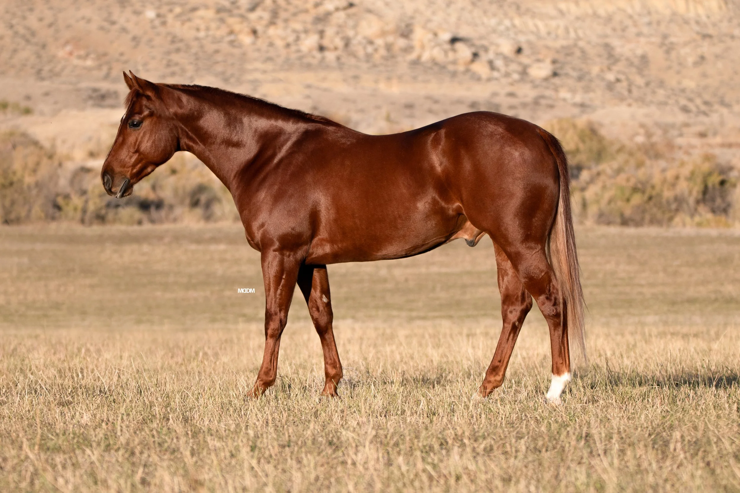 A chestnut horse with a white sock on its left hind leg standing in a grassy field.