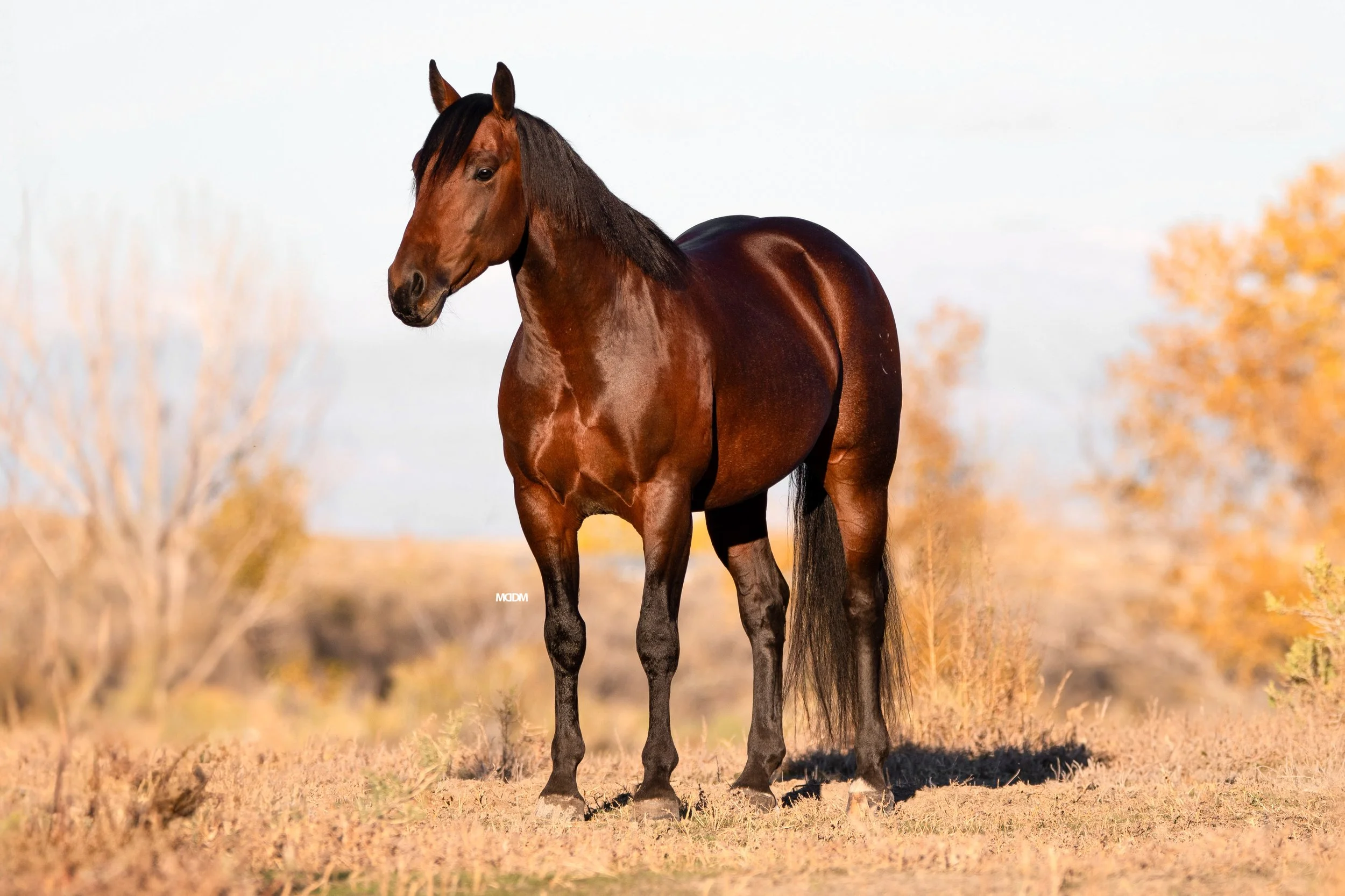 A brown horse with black mane and tail standing on dry grass in an open field with mountains in the background.